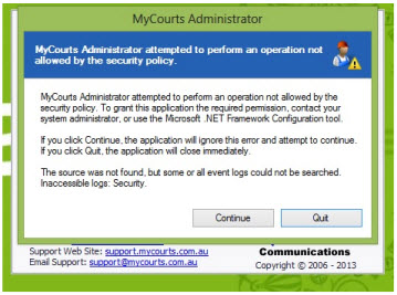 MyCourts has been installed and tested on the Vista, Win7 and Win8 operating systems and works "out-of-the-box". MyCourts Administrator requires elevated permissions however you will be advised by MyCourts Administrator at the time. You may be asked by the Operating System for 'Administrator Permission' if your level is not sufficient. For example: